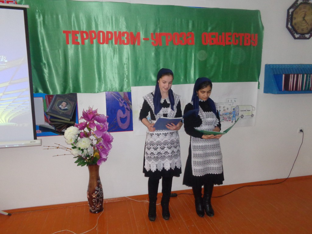 05.02.20155 февраля 2015г в МБОУ «СОШ с. Симсир им. Т.Д.Эрсанбиева» прошло внеклассное мероприятие среди учащихся 9-11 классов на тему: «Терроризм – угроза обществу», который остаётся главной угрозой безопасности нашего государства, главной угрозой для России, для всех наших граждан. Целью мероприятия было сформировать у учащихся представление о терроризме как историческом и политическом явлении; акцентировать внимание на необходимости проявления бдительности; ознакомить учащихся с основными правилами поведения в условиях теракта.