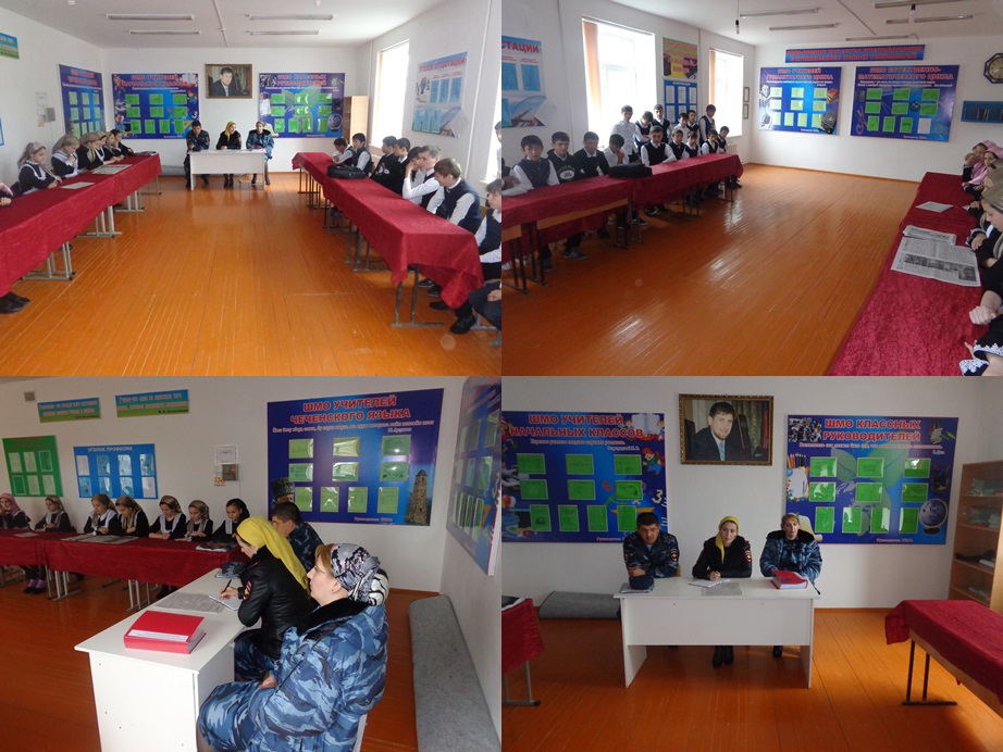 Работу по профилактике безнадзорности, подростковой преступности, формированию здорового образа жизни среди несовершеннолетних проводится во взаимодействии с работниками правоохранительных органов, сферы образования, специалистами медицинских и социальных служб, духовенства, учреждений культуры и спорта. В целях профилактики безнадзорности и беспризорности детей сотрудниками ПДН по плану проводятся профилактические мероприятия. В 13. 05. 2015 г. прошло мероприятие «Права и обязанности учащихся». На мероприятии присутствовали инспектора ОУУП и ПДН отдела МВД России по Ножай – Юртовскому району: старший лейтенант полиции Моидова М. А., старший лейтенант полиции Хасарханова У. Р. и капитан полиции Хасимханов М. А.. Сотрудники ПДН разъяснили подросткам их права и обязанности, говорили о мерах административной и уголовной ответственности за совершение правонарушений. Цель мероприятия – профилактика правонарушений, беспризорности, девиантного поведения среди подростков.